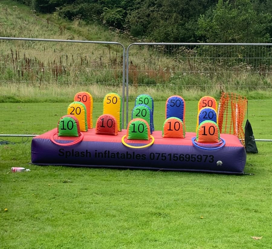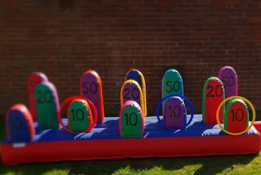 Throw the hoops over the targets and count your scores!